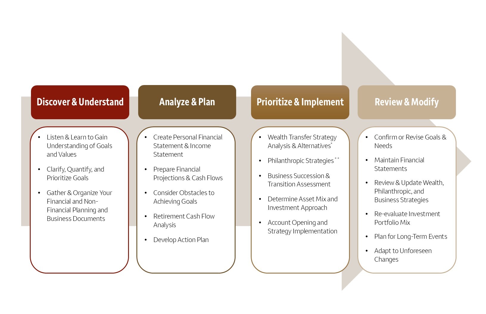 Your customized wealth management plan provides a roadmap for accomplishing your current goals and adapts to your evolving needs. We start by listening to learn what is important to you. This allows us to analyze and propose a plan for preserving, growing & transferring your wealth. We follow a consistent four-step process to tailor your plan to achieve your goals.