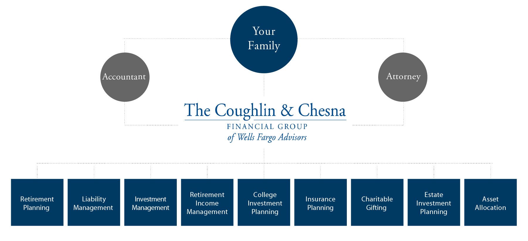 To address each client’s unique situation, we take a comprehensive approach to planning and consider your risk tolerance, time frame, assets, liabilities, and your personal situation. We draw on years of knowledge and experience, the extensive resources available throughout Wells Fargo Advisors and then coordinate our recommendations with your other professional advisors.