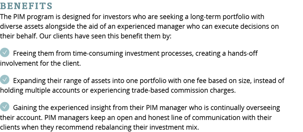 The PIM program is not designed for excessively traded or inactive accounts and is not appropriate for all investors. Please carefully review the advisory disclosure documents for a full description of our services. The minimum account size for this program is $50,000.